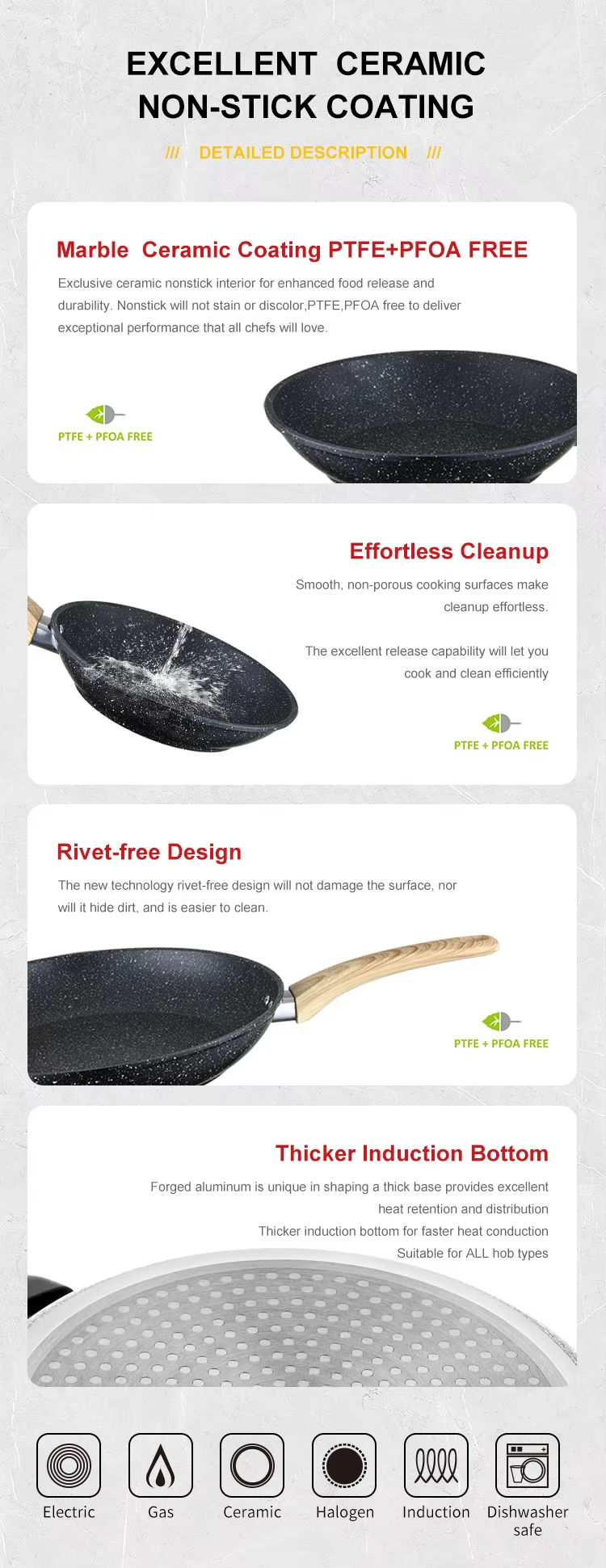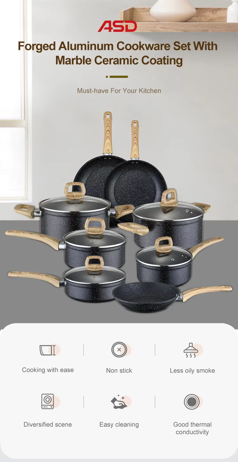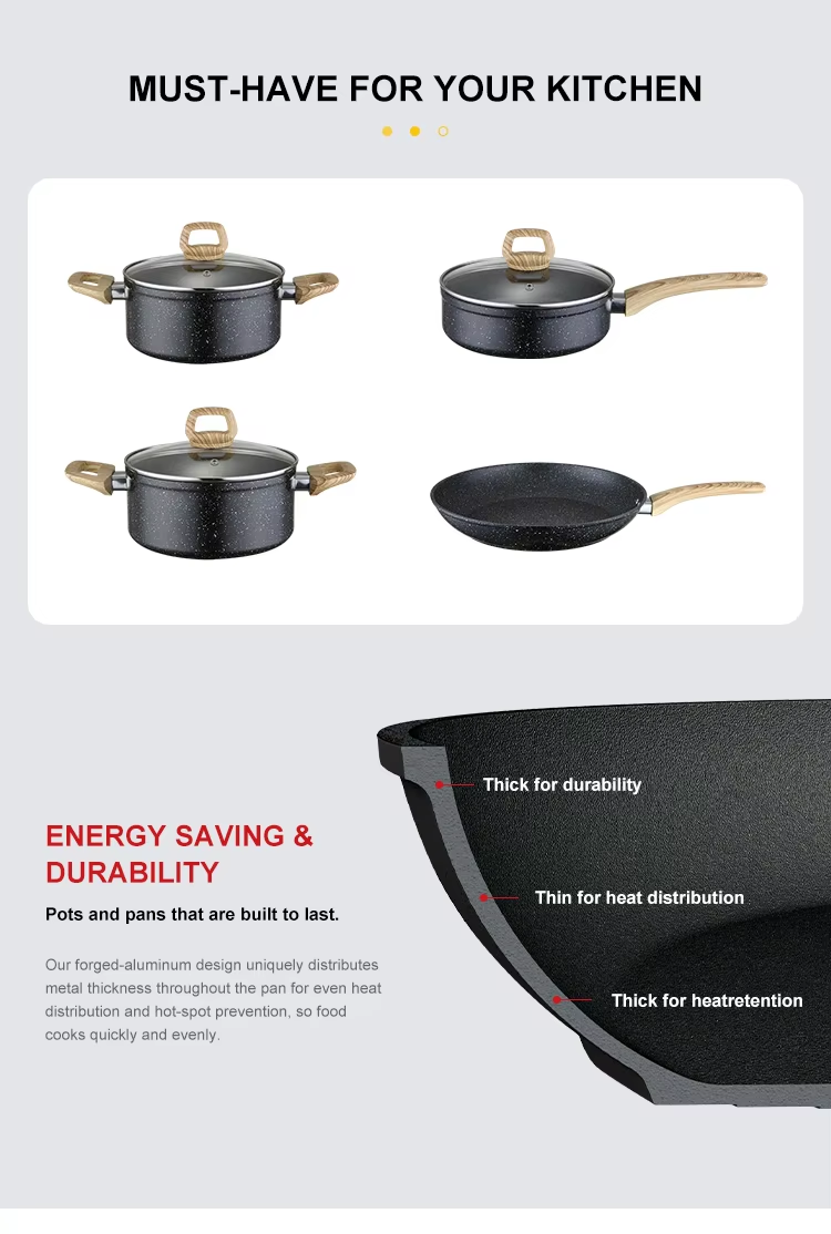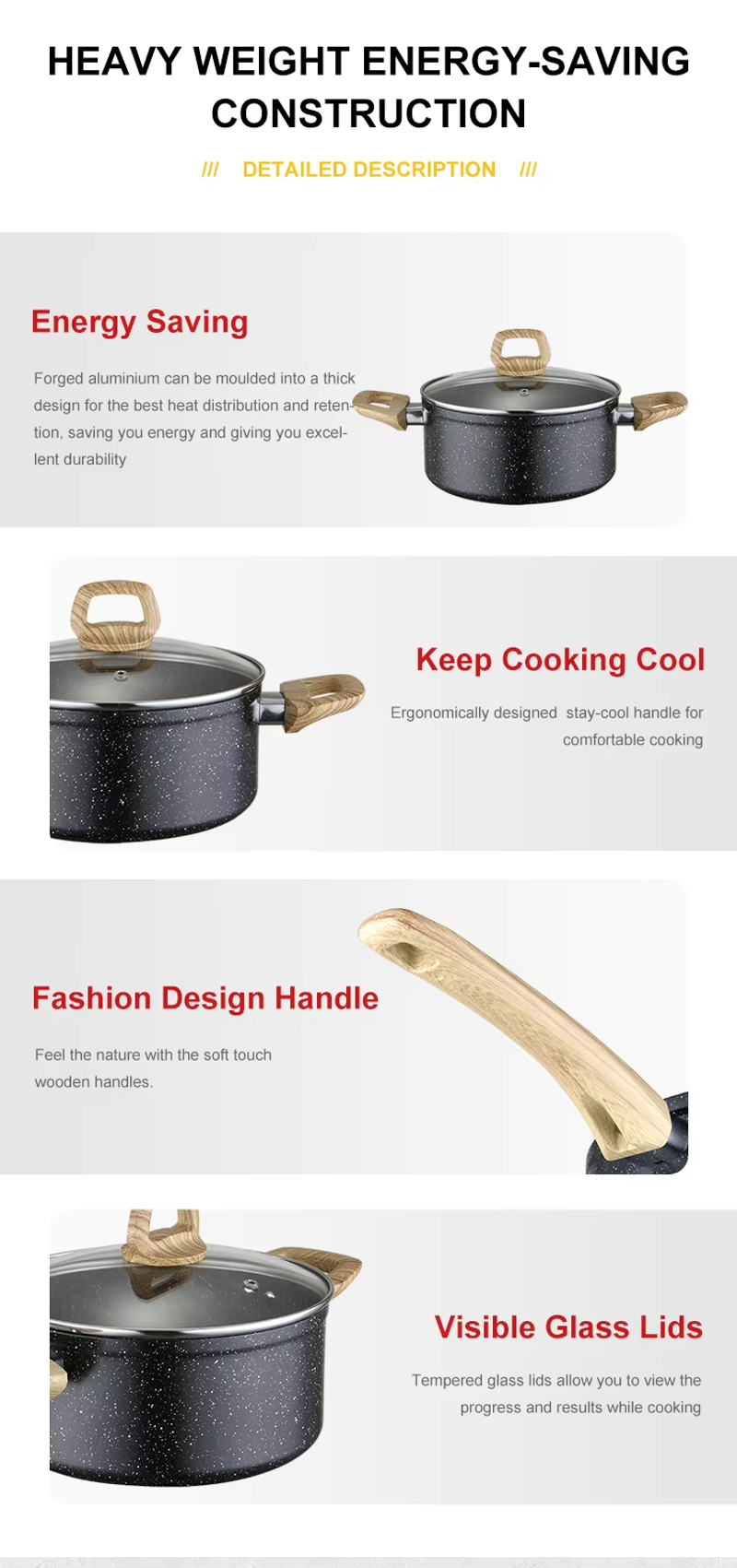 Trem de cozinha com revestimento em mármore, cabos em alumínio e madeira, revestimento duplo em granito, antiaderente, para fogões de indução.
